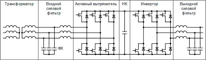 - инвертора – выполняет обратную преобразующую операцию, возвращая переменный ток с нормализованными параметрами;