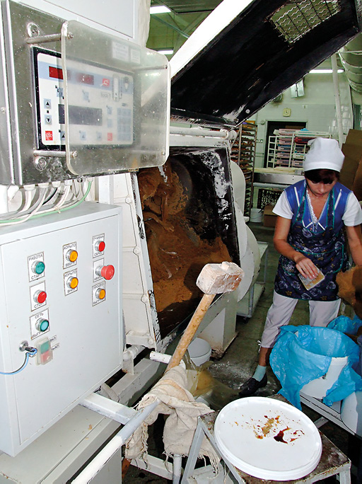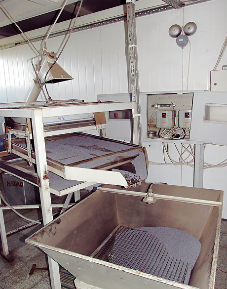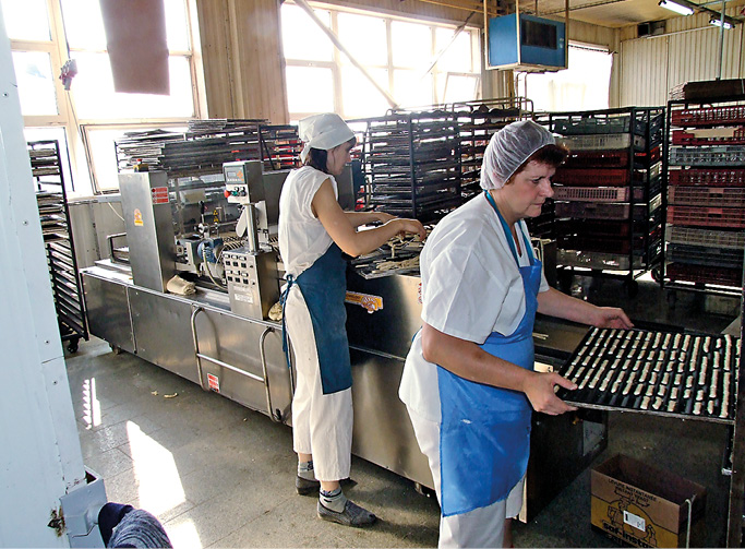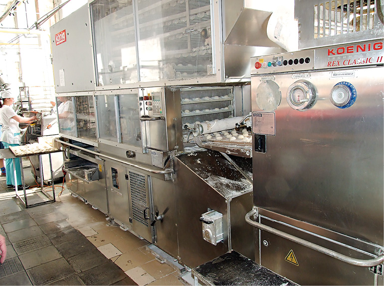 Немножко пообщавшись в кабинете главного энергетика, мы «принарядились в бурки», как выразился Константин Владимирович, то есть надели накидки и колпаки, и пошли смотреть по цехам. В начале мы понаблюдали за работой импортного комплекса разделки теста фирмы Kenig, который на заводе называют «кайзер», по названию одной из булочек, которые на нем делаются. Умная машина разделывает тесто, оно подходит, потом печется, и получаются булочки или рогалики. Как раз в нем, в «кайзере», установлен Веспер. Он и еще один штатный преобразователь управляют работой двух транспортеров, контроллер выдает задание, чтобы совместить их перемещение. Они приостанавливаются, ползут с разной скоростью, передают булочки с одного этапа на другой - и все совершенно автоматически.