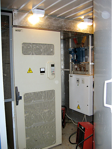 Диденко С.А.: - Да никак не влияют. Работает нормально. Там, в частотном преобразователе, ведь все продумано. Если он стоял выключенный, допустим, по причине отсутствия электропитания, то, прежде чем ввести его в работу, включается система предпускового подогрева. Когда она нагреет не только воздух в отсеке, но и прогреет все оборудование, только тогда дается разрешение на пуск двигателя. А модульное здание спроектировано так, что термоизоляция не позволяет теплу выходить наружу. Но в процессе работы все-таки возникает необходимость отвода лишнего тепла. Это делается, опять же, автоматически другой системой - приточно-вытяжной вентиляции, которая управляется другим, маленьким, частотным преобразователем, смонтированным внутри: интенсивность притока-оттока воздуха зависит от нагрузки на двигатель. И, если на улице температура упала, скажем, до минус 500, то система может вообще закрыть обратный клапан приточного вентилятора, и переохлаждения не произойдет.
